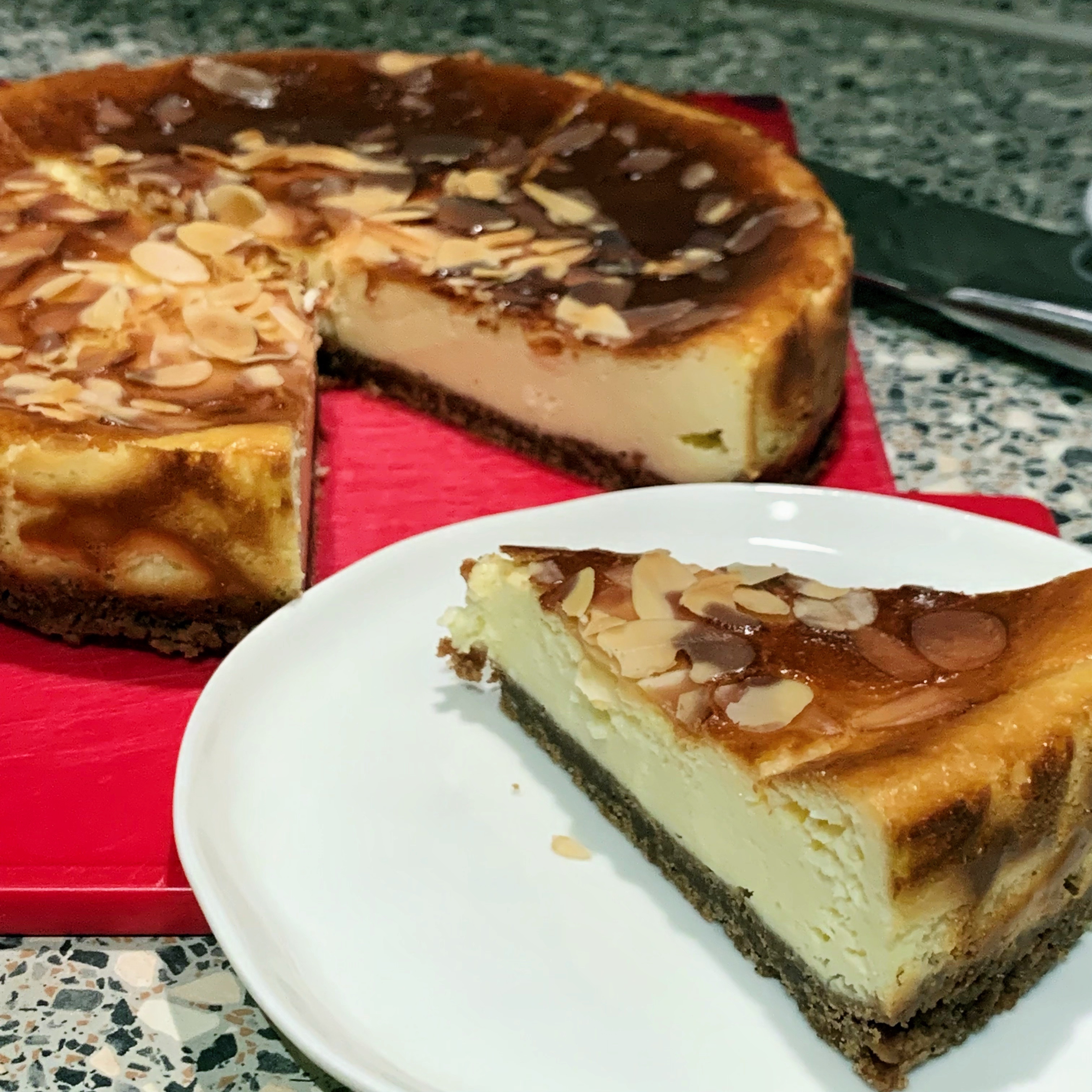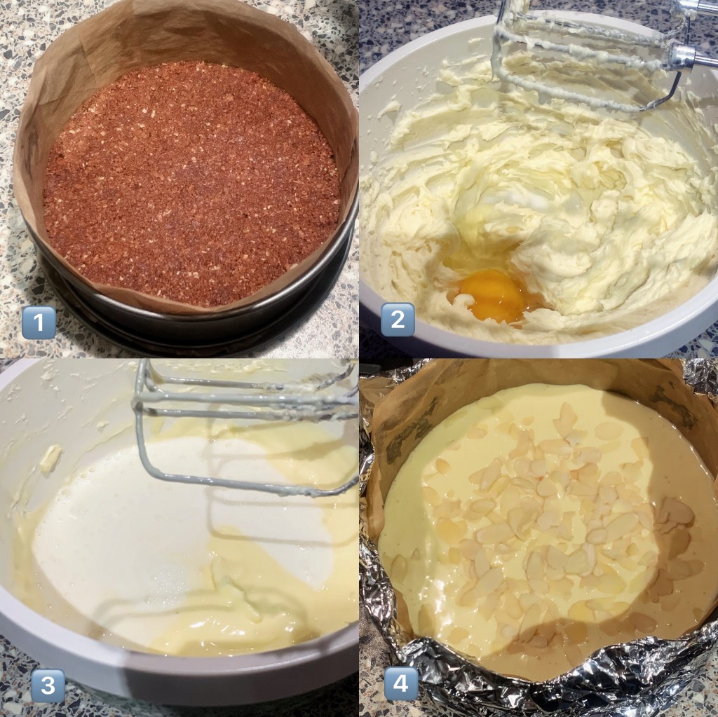 4️⃣ Take the cookie bottom out of the fridge, pour the filling on top, sprinkle shaved almonds on top and bake at 160 degrees celsius for 50 – 70 minutes. Baking time may vary based on the oven and your preference. I prefer mine creamy and fully baked through, so I did 70 minutes